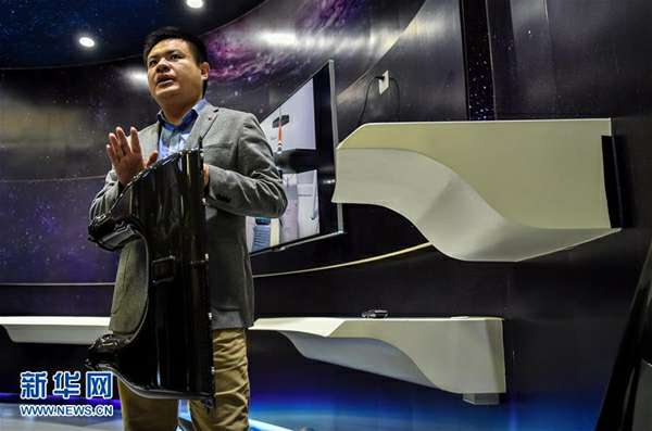 海归博士、深圳光启高等理工研究院院长刘若鹏在光启总部介绍地面行进装备超复合材料(9月7日摄)。新华社记者 毛思倩 摄
